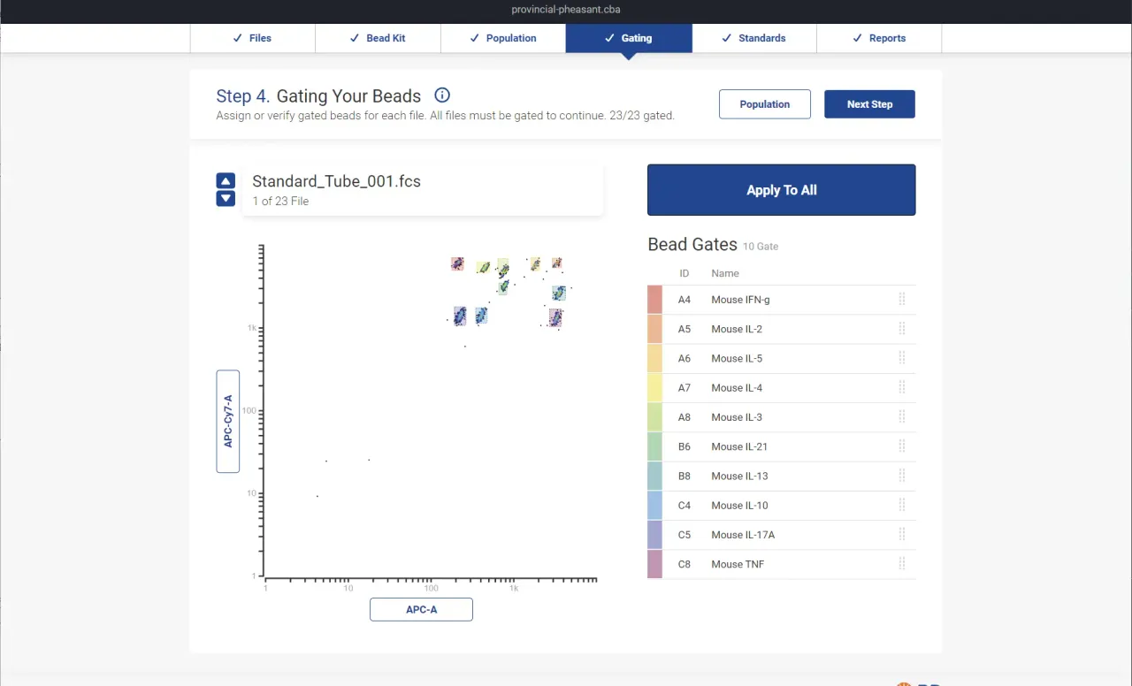 Population definition uses a FlowGrid clustering algorithm to automatically gate bead populations and filter debris out of the data. Researchers can adjust gates manually, but the automatic detection handles the common case without intervention.